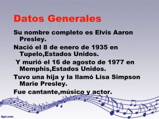 Elvis Aaron Presley nació en 1935 en Estados Unidos y fue cantante, músico y actor conocido como el Rey del Rock. Presley tocaba varios géneros musicales como rock and roll, country, blues y gospel. Murió en 1977 dejando un legado como una de las mayores figuras musicales de la historia por su estilo único y carisma en el escenario.