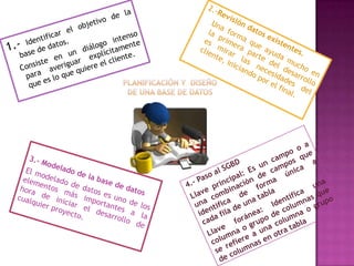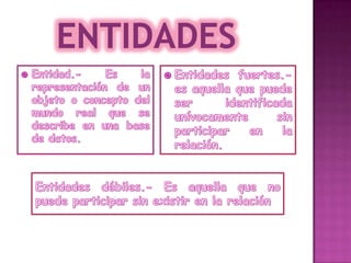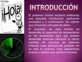 Este documento introduce conceptos básicos de bases de datos, incluyendo sus objetos constituyentes como tablas, registros, campos e índices. Explica que una base de datos almacena datos de manera estructurada para poder recuperarlos posteriormente, y que al crear una base de datos con SQL Server, los archivos de datos y registro crecen automáticamente a medida que se utiliza la base de datos. También resume los tipos de relaciones entre tablas como uno a uno, uno a varios y varios a varios.