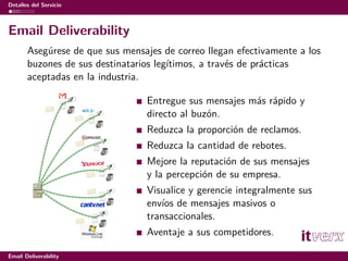 El servicio de email deliverability de Itverx asegura que los mensajes de correo lleguen a los buzones de los destinatarios legítimos, mejorando la reputación y reducción de rebotes. Ofrecen diagnósticos, herramientas personalizadas y monitoreo continuo para optimizar la entrega de correos masivos o transaccionales. La metodología incluye fases de exploración, implantación y soporte para estabilizar la operación y maximizar la efectividad de entrega.