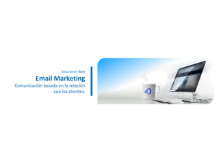 Este documento describe los servicios de email marketing que incluyen el diseño e implementación de plantillas de email, capacitación y soporte anual. Explica que el email marketing permite administrar contactos, grupos, eventos y plantillas para comunicarse con los clientes. También menciona que la solución se basa en tecnología PHP, MySQL, ASP o SQL server.