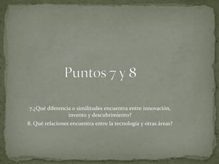 Este documento discute las diferencias y similitudes entre innovación, invento y descubrimiento. También explora las relaciones entre la tecnología y otras áreas como la ciencia, el diseño y la informática. Finalmente, señala que la relación entre tecnología y medio ambiente tiene el objetivo de cumplir con los requisitos de responsabilidad hacia las personas y el medio.