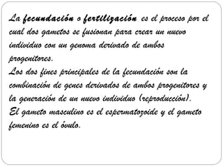 El documento describe las etapas del embarazo y el parto. Explica que la fecundación ocurre cuando el espermatozoide se une al óvulo, dando inicio a la formación del embrión. Luego describe las tres etapas del embarazo (meses 0-3, 3-6 y 6-9), durante las cuales el feto se desarrolla completamente. Finalmente, explica que el parto consta de tres etapas: la ruptura de la bolsa amniótica, las contracciones del útero y la expulsión de la placenta
