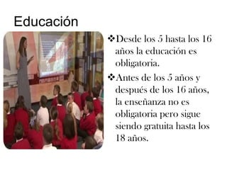 El documento describe el sistema educativo de Inglaterra. La educación es obligatoria entre los 5 y 16 años y gratuita hasta los 18. El 93% de los estudiantes asisten a escuelas públicas financiadas por el gobierno. El currículum nacional establece las asignaturas por etapas. Los estudiantes son evaluados periódicamente y al finalizar la educación secundaria. La educación superior se imparte en 144 instituciones incluyendo 73 universidades.