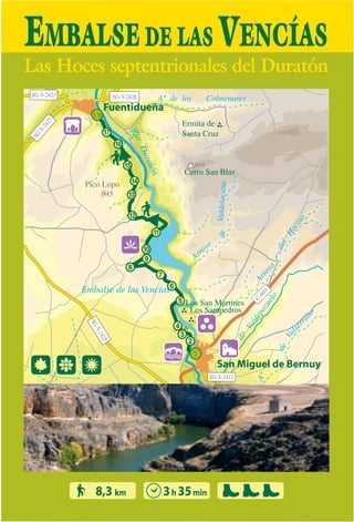 El documento describe una ruta de 8.3 km a lo largo del cañón formado por el río Duratón entre las localidades de San Miguel de Bernuy y Fuentidueña. La ruta comienza cruzando un puente de piedra y sigue las orillas del embalse de Las Vencías, pasando ruinas de ermitas, valles y alambradas, hasta llegar a los páramos de Fuentidueña y los bosques de pinares, con vistas del Sistema Central. La ruta desciende gradualmente hasta llegar a la villa de Fuent