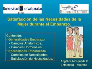 Este documento describe los cambios fisiológicos y las necesidades que experimenta una mujer durante el embarazo. Explica los cambios anatómicos, hormonales y fisiológicos que ocurren, así como las necesidades relacionadas con la oxigenación, nutrición, eliminación, higiene, termorregulación, movimiento y descanso. También detalla cómo satisfacer estas necesidades a través de hábitos saludables y el autocuidado para promover el bienestar de la madre y el feto.