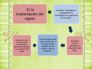 El embarazo implica cambios fisiológicos, metabólicos y morfológicos en la mujer para proteger, nutrir y permitir el desarrollo del feto durante la gestación. Puede presentar síntomas como dolores de cabeza, molestias al orinar, náuseas y vómitos. Existen diferentes tipos de embarazo como el intrauterino, ectópico, molar, intraabdominal o múltiple, así como embarazos de alto riesgo.
