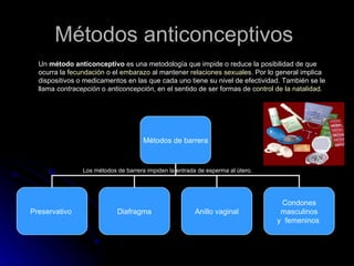 El documento describe el proceso de fecundación, desde el encuentro de los gametos hasta la fusión de los pronúcleos del óvulo y el espermatozoide. También explica los diferentes métodos anticonceptivos, naturales y quirúrgicos, y describe las etapas del embarazo mes a mes, incluyendo cambios en el feto.