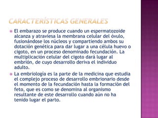 El documento describe el proceso del embarazo, incluyendo su definición como el período entre la implantación del óvulo fecundado y el parto, los cambios fisiológicos de la mujer para nutrir y proteger al feto, y los signos iniciales del embarazo como la ausencia de la menstruación y síntomas como mareos y antojos.