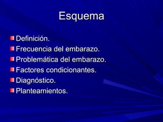 El documento trata sobre el embarazo en la adolescencia. Define el embarazo adolescente como aquel que ocurre entre los 11 y 19 años. Explica que tiene un origen multifactorial, incluyendo factores biológicos, psicológicos y socioculturales. Detalla los riesgos que conlleva para la madre y el bebé, así como posibles planteamientos y la importancia de prevenirlo a través de la educación y el acceso a anticonceptivos.