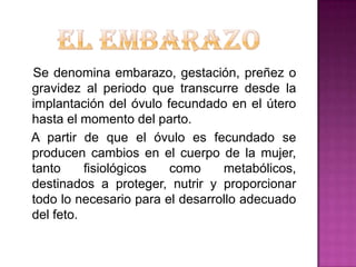 El embarazo es el periodo desde la implantación del óvulo fecundado en el útero hasta el parto, durante el cual el cuerpo de la mujer experimenta cambios fisiológicos y metabólicos para nutrir y proteger al feto en desarrollo, haciendo del embarazo la mejor etapa en la vida de una mujer.
