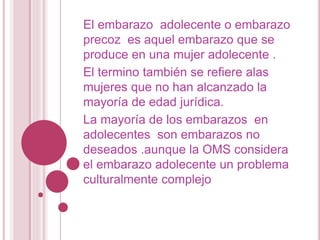 Este documento trata sobre el embarazo adolescente, definido como un embarazo en una mujer que aún no ha alcanzado la mayoría de edad legal. La mayoría de los embarazos adolescentes son no deseados. Las adolescentes embarazadas enfrentan riesgos adicionales para su salud y desarrollo físico en comparación con mujeres mayores. El documento concluye resaltando la necesidad de campañas de educación sexual y apoyo a adolescentes embarazadas para promover una sexualidad responsable y prevenir embarazos no deseados.