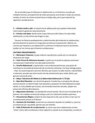 El documento describe el fenómeno del embarazo adolescente, incluyendo factores que lo predisponen y determinan, así como consideraciones psicosociales. Se define el embarazo adolescente como aquel que ocurre entre los 10 y 19 años. Los factores que lo predisponen incluyen una menarquia temprana, relaciones sexuales precoces, y familias disfuncionales. Las consecuencias incluyen el abandono de los estudios y menores oportunidades laborales para la madre adolescente, así como mayores riesgos para la salud del hijo.