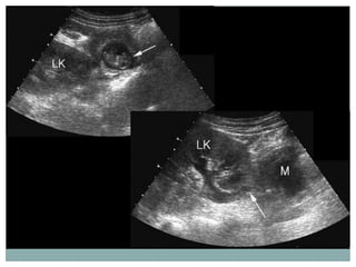 Este documento describe los diferentes tipos de embarazo ectópico, incluyendo los más comunes como el tubárico y los menos frecuentes como el intersticial, ovárico y cervical. Explica los hallazgos ecográficos característicos de cada tipo y los factores de riesgo asociados. Además, detalla los síntomas, el abordaje diagnóstico y las complicaciones que puede presentar cada uno.