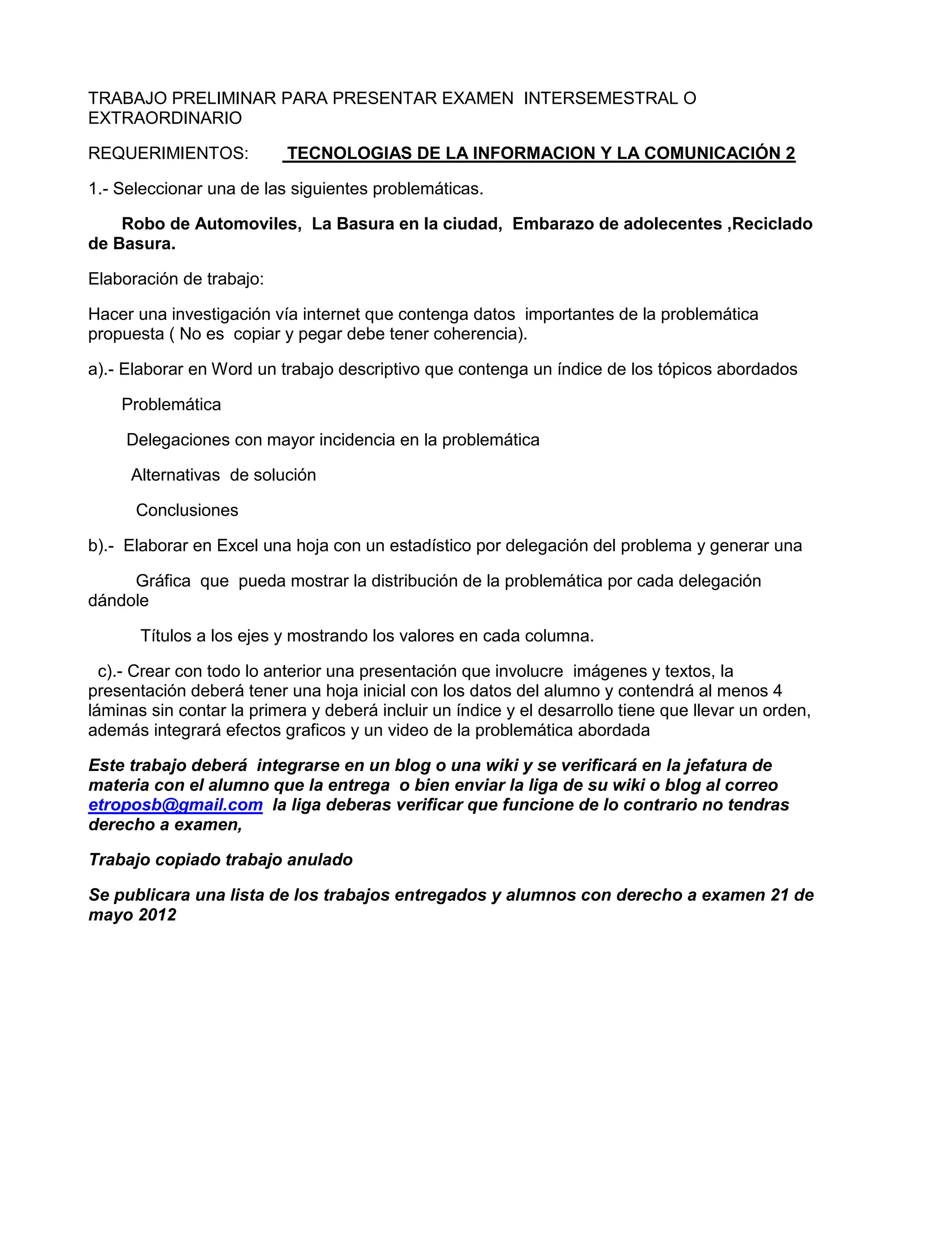 Este documento presenta los requerimientos para un proyecto escolar sobre problemas sociales como el embarazo adolescente. Los estudiantes deben investigar una problemática, crear un informe en Word, una hoja de cálculo en Excel y una presentación en PowerPoint. El documento también incluye información sobre el embarazo adolescente, incluyendo estadísticas, causas, riesgos médicos y soluciones como la abstinencia y métodos anticonceptivos.