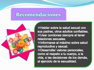 El embarazo en adolescentes entre 14 y 15 años ha aumentado y trae consecuencias como abandonar la escuela, perder oportunidades y problemas de salud, ya que los adolescentes no están preparados física ni psicológicamente para el embarazo, parto y crianza. Los embarazos entre 19 y 35 años son de bajo riesgo cuando están controlados, mientras que menores de 18 o mayores de 35 años son de alto riesgo.