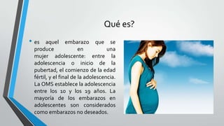 Este documento define un embarazo en adolescentes como uno que ocurre entre los 10 y 19 años. Las principales causas incluyen falta de información sobre anticonceptivos, falta de comunicación familiar, roles de género, falta de autoestima y violación. Las consecuencias son físicas como anemia y riesgos de muerte materna, psicológicas como depresión y baja autoestima, y sociales como deserción escolar y dificultad para conseguir empleo. Los países desarrollados tienen las tasas más altas de embarazos en adolesc