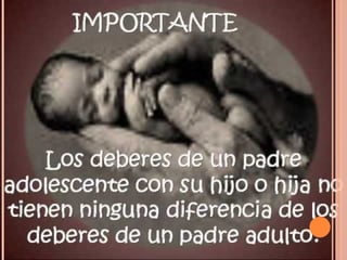 El documento trata sobre la adolescencia y el embarazo en la adolescencia. Explica que la adolescencia es el período entre los 10 a 20 años donde se adquiere la capacidad reproductiva y se transita de la niñez a la adultez. El embarazo en la adolescencia conlleva riesgos para la salud de la madre y el bebé. Factores psicosociales como la estructura familiar, nivel educativo y sociocultural influyen en los embarazos adolescentes.
