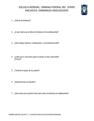 El documento presenta una encuesta sobre el embarazo adolescente realizada por la Escuela Normal Urbana Federal del Istmo. La encuesta contiene 7 preguntas relacionadas con la definición de embarazo, las posibles causas del embarazo en adolescentes, los riesgos de embarazarse a temprana edad, el impacto que tendría un hijo en esa etapa de la vida, el apoyo familiar, la continuidad de los estudios y posibles medidas para prevenir el embarazo en adolescentes.
