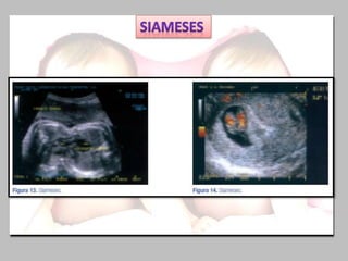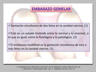 El documento trata sobre el embarazo y parto gemelar. Explica que es la gestación simultánea de dos fetos en la cavidad uterina y conlleva mayores riesgos que un embarazo único, como parto prematuro y complicaciones. También describe los diferentes tipos de gemelos y las complicaciones específicas de cada uno.