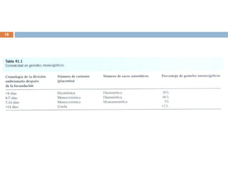 El documento resume los diferentes tipos de embarazo múltiple, incluyendo gemelos bicigóticos y monocigóticos. Explica que los gemelos monocigóticos pueden ser bicoriónicos-biamnióticos, monocoriónicos-biamnióticos, o monocoriónicos-monoamnióticos, dependiendo del momento de la división del huevo. También describe posibles complicaciones como la transfusión feto-fetal y el crecimiento intrauterino restringido, así como opciones de tratamiento.