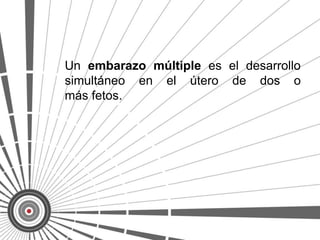 Un embarazo múltiple es el desarrollo simultáneo de dos o más fetos en el útero. Los embarazos múltiples pueden resultar de la fertilización de un solo óvulo que se divide (monocigóticos) o de la fertilización de múltiples óvulos (bicigóticos). Los embarazos múltiples tienen mayor riesgo de complicaciones para la madre y el feto.