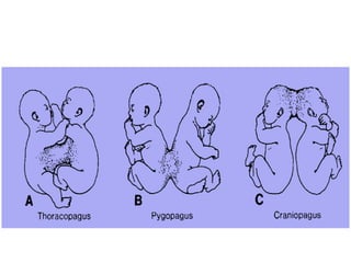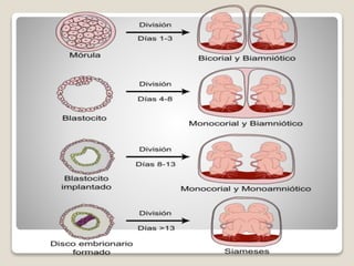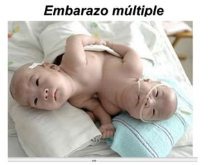 El documento detalla el aumento de embarazos múltiples, especialmente debido a técnicas de reproducción asistida y a la mayor edad materna, destacando la clasificación de gemelos en monocigóticos y dicigóticos, así como sus complicaciones asociadas. Se enumeran riesgos significativos como mortalidad perinatal, anomalías congénitas y síndromes de transfusión, especialmente en gestaciones monocoriónicas. Se concluye que los profesionales de la salud deben estar preparados para manejar estas complejidades en el cuidado maternal e infantil.