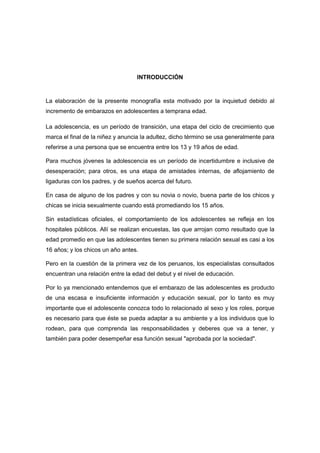 Este documento trata sobre los embarazos en adolescentes. Explica que la adolescencia es una etapa de transición entre la niñez y la adultez que abarca entre los 13 a 19 años. Describe las causas de los embarazos adolescentes como la falta de educación sexual e información, así como factores socioculturales. Presenta objetivos como conocer las reacciones de las adolescentes embarazadas y sus niveles de información sexual.