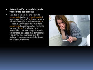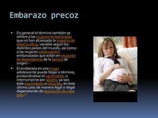 El documento describe el embarazo adolescente o precoz, definido por la OMS como aquel que ocurre entre los 10 y 19 años. Explica que cada año nacen 13 millones de niños de madres menores de 20 años, sobre todo en países en desarrollo. Las tasas varían en todo el mundo, siendo las más altas en Níger y Congo, donde más del 50% de las mujeres dan a luz antes de los 18 años, y las más bajas en Corea del Norte, Corea del Sur y Japón. Los factores sociales y culturales influyen en