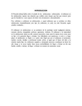 El documento aborda el impacto del embarazo precoz en adolescentes, destacando sus riesgos médicos y sociales, así como las consecuencias para la madre y el hijo. Se manifiestan problemas como abandono educativo, dificultades económicas y emocionales, y un ciclo de pobreza persistente. Se sugieren recomendaciones para la prevención, incluida la educación sexual y el uso de métodos anticonceptivos.