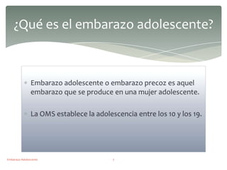 El documento trata sobre un estudio de investigación sobre el embarazo adolescente. Presenta algunas preocupaciones como la desprotección de mujeres jóvenes en el sistema de salud y las limitaciones al desarrollo personal que puede causar un embarazo a temprana edad. El estudio busca adoptar prácticas ante las consecuencias del embarazo adolescente mediante una investigación cualitativa, ya que no existen estudios similares en el país.