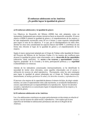 Este documento discute el embarazo adolescente en América Latina y el Caribe y su relación con la igualdad de género. Presenta datos sobre las tasas de embarazo entre adolescentes de 15 a 19 años en varios países de la región, que fluctúan entre el 12.2% en Perú y el 24.6% en Nicaragua. Explica que el embarazo adolescente está asociado con mayores riesgos de salud para las madres y sus hijos, y suele limitar las oportunidades educativas y económicas de las jó