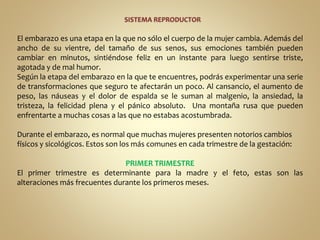 El documento describe los cambios físicos y psicológicos comunes que experimentan las mujeres durante los tres trimestres del embarazo, incluyendo náuseas, cansancio, aumento de peso, cambios de humor, ansiedad y dolores de espalda. También discute otros cambios como la caída del cabello, manchas en la piel, varices en las piernas, y estrías, así como creencias populares sobre el embarazo.