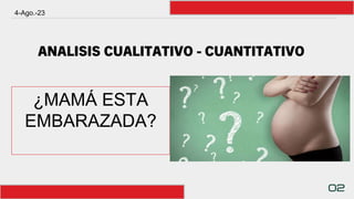 Este documento compara análisis cualitativos y cuantitativos para determinar si una mujer está embarazada. Describe varios métodos cualitativos antiguos como observación del crecimiento del vientre y cambios en los pezones. Luego explica que las pruebas cuantitativas como pruebas de embarazo en orina o sangre que detectan la hormona hCG son más confiables para diagnosticar un embarazo que observaciones subjetivas. Concluye que para un diagnóstico preciso se debe consultar a un profesional de la salud para