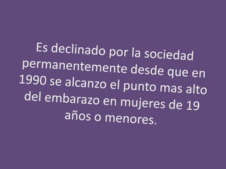 El documento habla sobre los embarazos en adolescentes y los riesgos asociados. Algunas razones por las que las adolescentes quedan embarazadas incluyen falta de información sobre sexualidad responsable, carencia de apoyo y baja autoestima. En México, 90 de cada mil adolescentes se embarazan, en comparación con solo 4 de cada mil en China, lo que demuestra la influencia de las costumbres culturales. El documento también menciona varios métodos anticonceptivos como la píldora, el diafragma y el preservativo, señalando