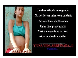 El documento habla sobre los embarazos no deseados. Explica que muchos de estos embarazos ocurren en adolescentes debido a la falta de información sobre anticonceptivos. También detalla los riesgos de un embarazo a temprana edad para la salud de la madre y el bebé. Además, señala que un embarazo no deseado puede afectar negativamente el futuro de la adolescente.