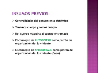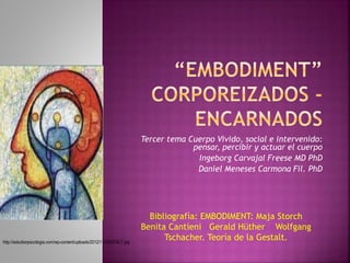 El documento discute el concepto de "embodiment" y cómo esto cambia nuestra comprensión de la inteligencia humana. Explica que la cognición ocurre a través de la interacción del cerebro, la mente y el cuerpo con el entorno, y no es simplemente el procesamiento pasivo de símbolos. También describe cómo la percepción humana involucra configurar patrones activamente en lugar de reflejar pasivamente el mundo exterior, y cómo los símbolos y el pensamiento dependen de estar "embodied" o encarnados en un cuerpo.