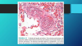 El documento describe diferentes tipos de embolia, incluyendo émbolos sólidos, líquidos y gaseosos. Explica que un émbolo es una masa que se libera en los vasos sanguíneos y es transportada a otras áreas, pudiendo obstruir el flujo sanguíneo. Describe las consecuencias como infartos e insuficiencia de órganos si el flujo sanguíneo es bloqueado. También explica las diferentes etapas del shock, una condición potencialmente mortal que puede ocurrir si no se corrige la