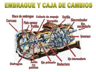 El documento describe el sistema de transmisión de un vehículo, incluyendo el embrague. Explica que el embrague permite transmitir y detener la energía mecánica del motor a las ruedas, y describe los tipos de embragues, como los de fricción de disco simple, de muelles y de diafragma. También explica cómo funciona el embrague de fricción de disco simple al embragar y desembragar.
