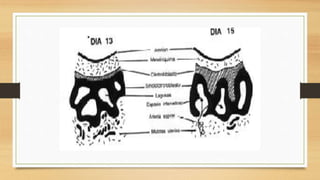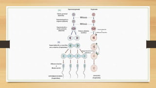 Este documento trata sobre la embriología y las células reproductoras. Explica que la embriología es el estudio del desarrollo prenatal del individuo. Describe las células somáticas y germinales, así como los cromosomas. También describe los procesos de fecundación, mitosis, meiosis y la maduración de las células germinales masculinas y femeninas. Finalmente, resume los aparatos reproductores masculino y femenino.