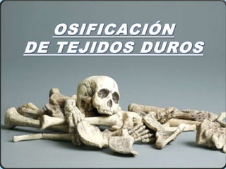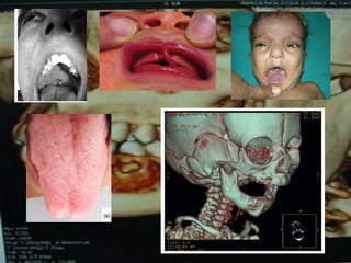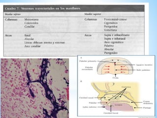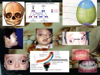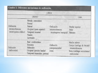 El documento describe el desarrollo de la cabeza y la cara durante las primeras etapas del desarrollo embrionario. En las primeras 4-9 semanas se forman las estructuras fundamentales como el estomodeo (boca primitiva), los procesos maxilares y mandibulares, y las prominencias faciales. Estas estructuras se fusionan para formar la mandíbula, mejillas y otras partes de la cara. Adicionalmente, se forman la cavidad oral, el paladar y la separación entre la boca y la nariz. El