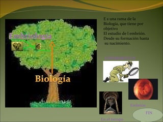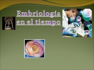 La embriología estudia el desarrollo del embrión desde su formación como una célula fertilizada hasta el nacimiento. Se divide en tres ramas: experimental, comparativa y moderna. Existen varias teorías sobre el desarrollo embrionario, como la preformación y la epigenesis. La ontogenia describe el desarrollo de un organismo individual desde el óvulo fertilizado hasta la edad adulta, mientras que la filogenia estudia la evolución de las especies a lo largo del tiempo.
