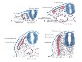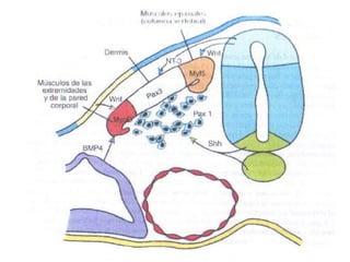 El documento describe el desarrollo del sistema muscular en el cuerpo humano. Explica que los músculos se originan a partir de las somitas en el mesodermo paraxial durante las primeras etapas del desarrollo embrionario. Las somitas forman el músculo esquelético estriado del esqueleto axial, la pared corporal y las extremidades. Los factores de transcripción y señales moleculares como SHH, BMP4 y FGF guían la formación y patrón de los diferentes tipos de músculo.