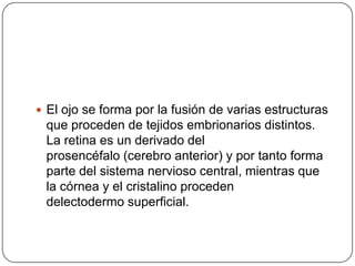 El ojo se forma por la fusión de tejidos embrionarios distintos, con la retina derivada del prosencéfalo y por lo tanto parte del sistema nervioso central, mientras que la córnea y el cristalino proceden del ectodermo superficial. El origen embrionario de las estructuras oculares incluye el ectodermo superficial para la córnea y cristalino, el neuroectodermo para la retina e iris, y el mesodermo para la esclerótica y tejidos conjuntivos.