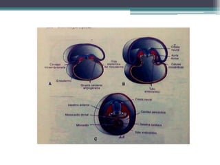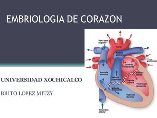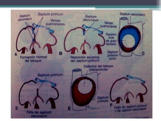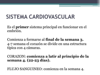 El documento resume las principales etapas del desarrollo embriológico del corazón y el sistema cardiovascular, incluyendo la formación inicial del corazón, el desarrollo de las cámaras cardíacas, la separación de los vasos sanguíneos y las posibles anomalías. Explica que el corazón comienza a latir en la cuarta semana y que entre la cuarta y séptima semana se divide en una estructura de cuatro cámaras. También describe los procesos de tabicamiento de las aurículas, ventrículos y