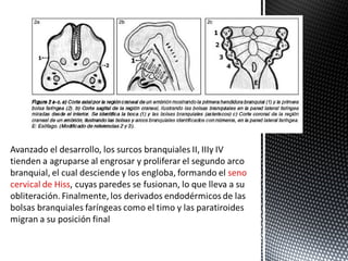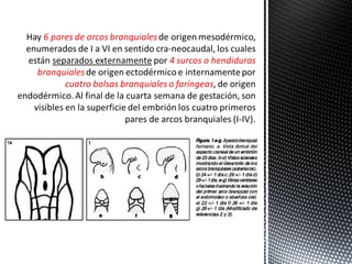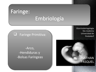 La faringe primitiva se desarrolla a partir de los arcos branquiales y las bolsas faríngeas entre la cuarta y quinta semana de desarrollo embrionario. Se forman cuatro pares de bolsas faríngeas que dan origen a diferentes estructuras como la trompa de Eustaquio, la amígdala palatina y las glándulas paratiroides. El piso de la cavidad oral y la faringe se forma a partir de la fusión de los extremos anteriores de los arcos branquiales.