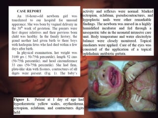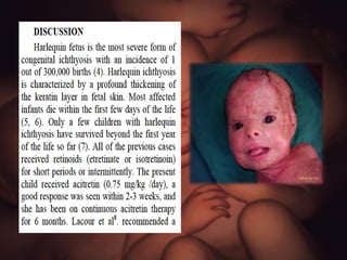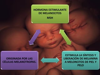 El documento presenta información sobre la embriogénesis e histología funcional de la piel. Explica que la piel se desarrolla a partir de la ectoderma y pasa por diferentes etapas de proliferación y citodiferenciación para formar los distintos estratos de la epidermis. También describe el desarrollo de anexos como las glándulas sudoríparas, sebáceas y mamarias, así como el desarrollo del vello y uñas. Finalmente, menciona algunos trastornos de la queratinización y