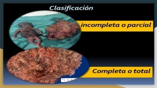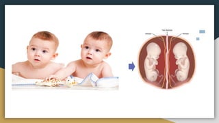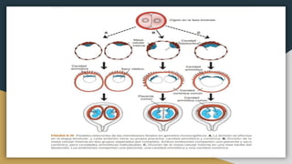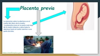 Este documento trata sobre diferentes temas relacionados con la placenta y el embarazo. Explica que la placenta previa ocurre cuando la placenta cubre parcial o completamente la abertura del cuello uterino. También describe los diferentes tipos de placenta previa y las complicaciones que puede causar en la madre. Además, analiza las causas y características de los gemelos monocigóticos y dicigóticos, que se originan de un solo óvulo fecundado o de óvulos distintos, respectivamente.
