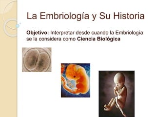 La embriología se considera una ciencia biológica desde 1839, cuando las investigaciones demostraron que el desarrollo embrionario ocurre mediante la división celular. La embriología estudia el desarrollo de los embriones animales desde la fecundación hasta el feto, incluyendo las etapas pre-embrionarias, embrionarias y fetales. Además, analiza de forma individual el origen y desarrollo de los órganos, sistemas y aparatos.
