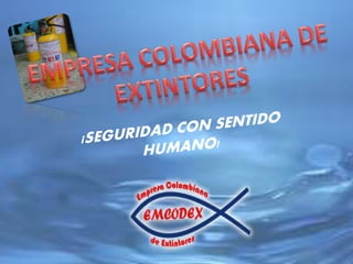 EMCODEX es una empresa colombiana especializada en brindar servicios de seguridad e higiene industrial para proteger personas y propiedades a través de personal capacitado. La empresa busca ser reconocida a nivel nacional e internacional por su experiencia, confiabilidad y enfoque en la satisfacción de clientes. EMCODEX ofrece servicios como lavado de tanques, mantenimiento, fumigaciones, suministro de extintores y botiquines, dotación industrial, y señalización para garantizar la seguridad en actividades laborales.