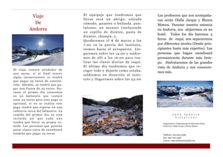 El Departamento de Educación Física del instituto HOTANSA organizará un viaje de esquí a Andorra del 8 al 13 de marzo para estudiantes de 1o de Bachillerato y 4o de ESO. El viaje costará unos 422 euros e incluirá alojamiento en hotel, clases diarias de esquí de 3 horas según el nivel de cada estudiante, y actividades para conocer Andorra.